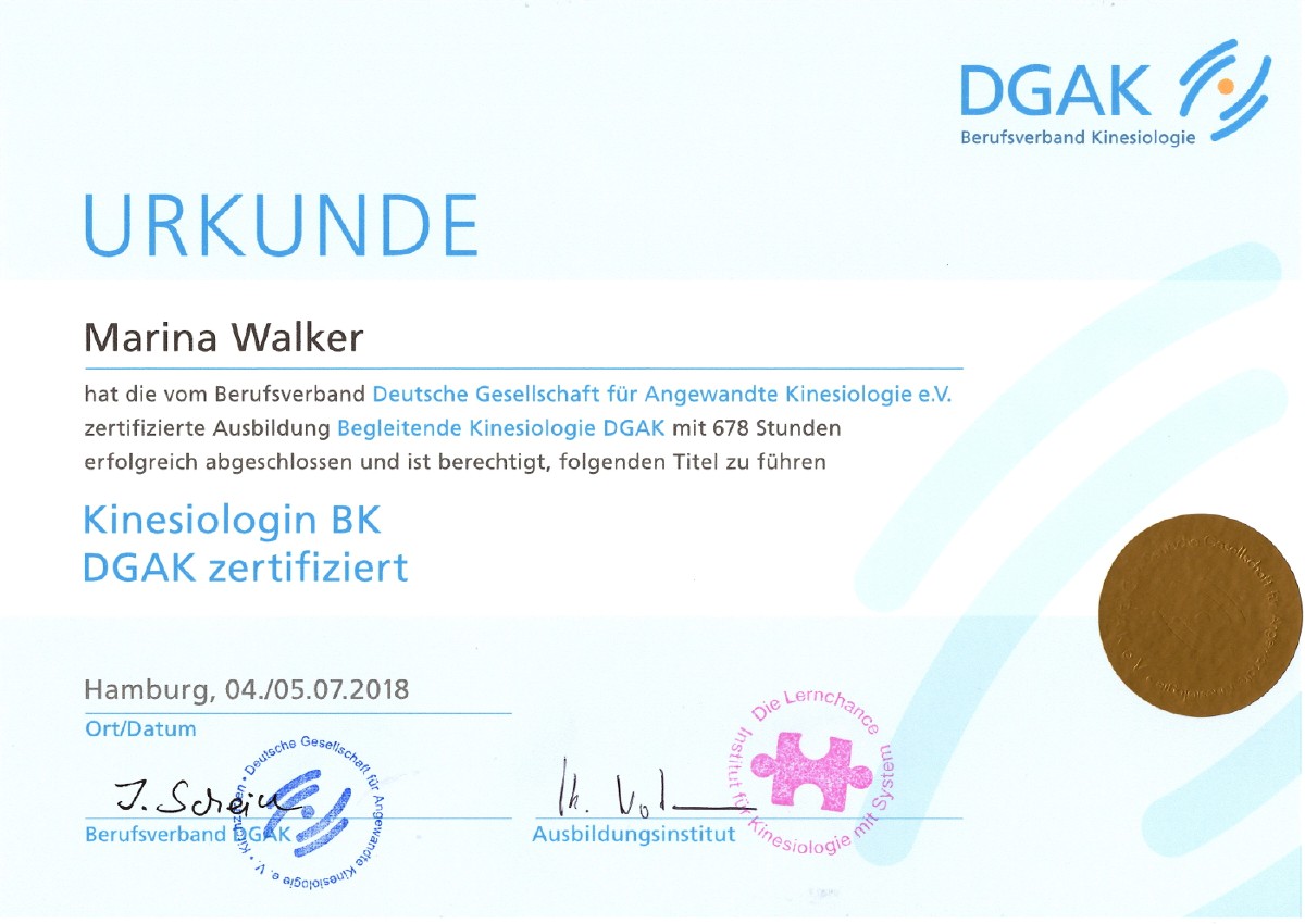 Ich heiße Marina Walker, bin am 30.06.1970 geboren und Mutter von zwei Söhnen. Ich lebe und arbeite in Hamburg. Im Hauptberuf bin ich Bilanzbuchhalterin. Meine wahre Berufung ist jedoch die Kinesiologie.